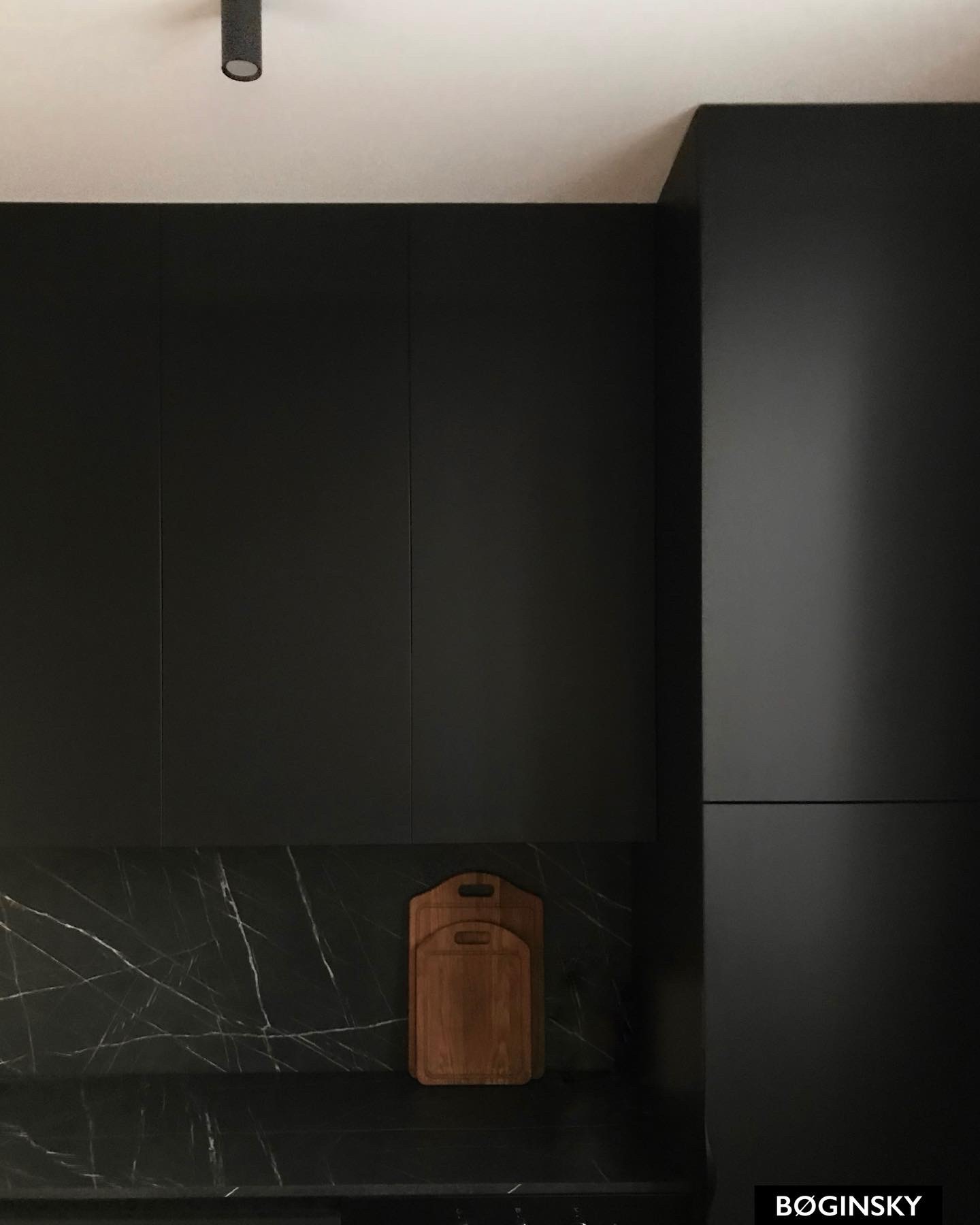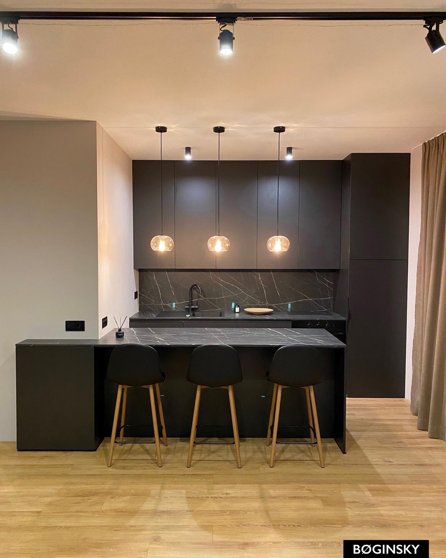 Для кухні ми обрали цікаву конфігурацію – вздовж стіни ми розмістили умивальник, посудомийну машину, компактну індукційну поверхню, духову шафу та вбудований холодильник.