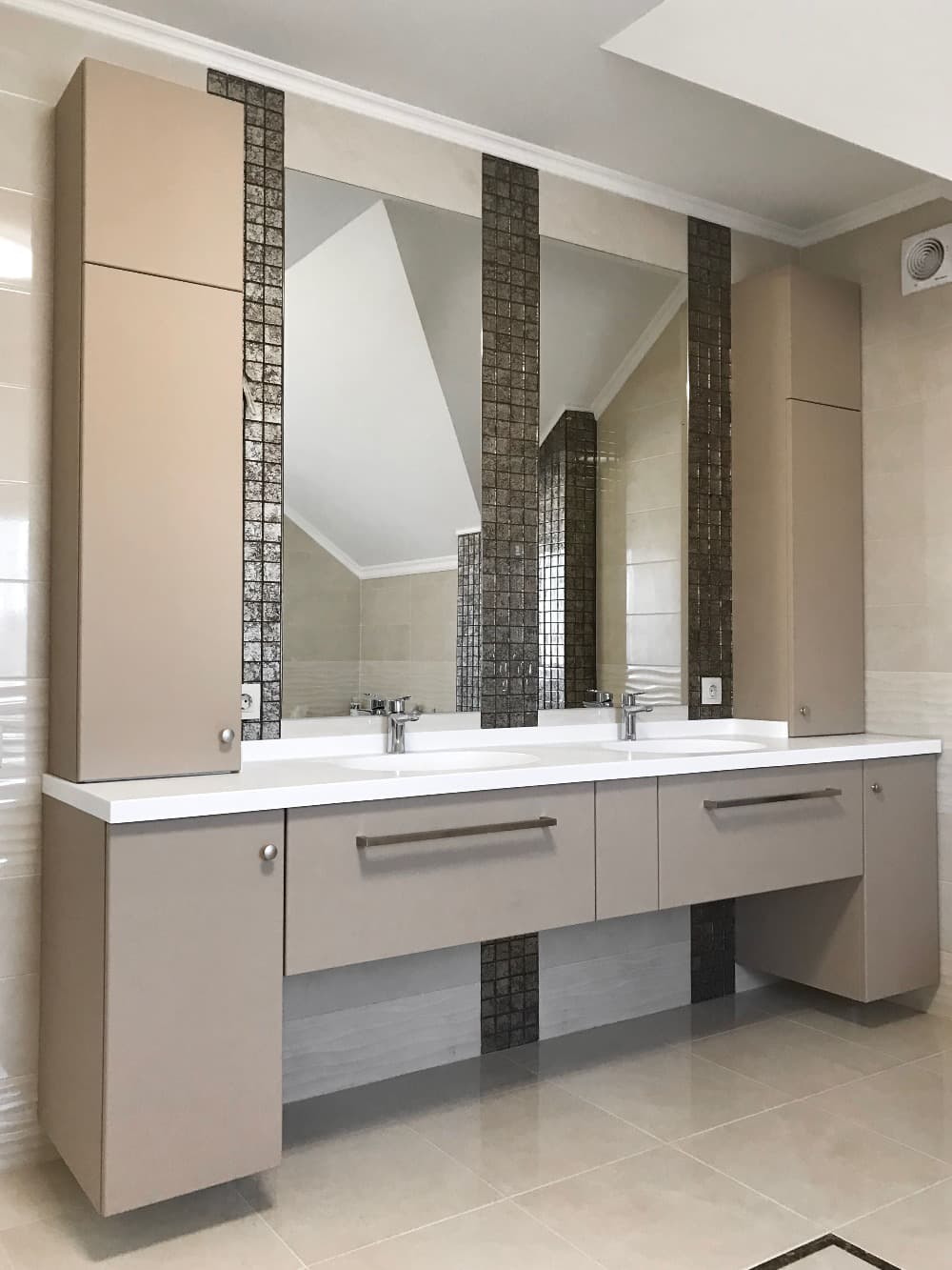 В этой ванной комнате мы установили необычную конструкцию, которую изготовили ориентируясь на визуализацию дизайнера заказчика, которую вы можете увидеть на последнем фото. Комплект состоит из тумбы на две раковины с двумя выдвижными ящиками и примыкающими в ней пеналами вверху и снизу, с дверьми и полками для хранения внутри.