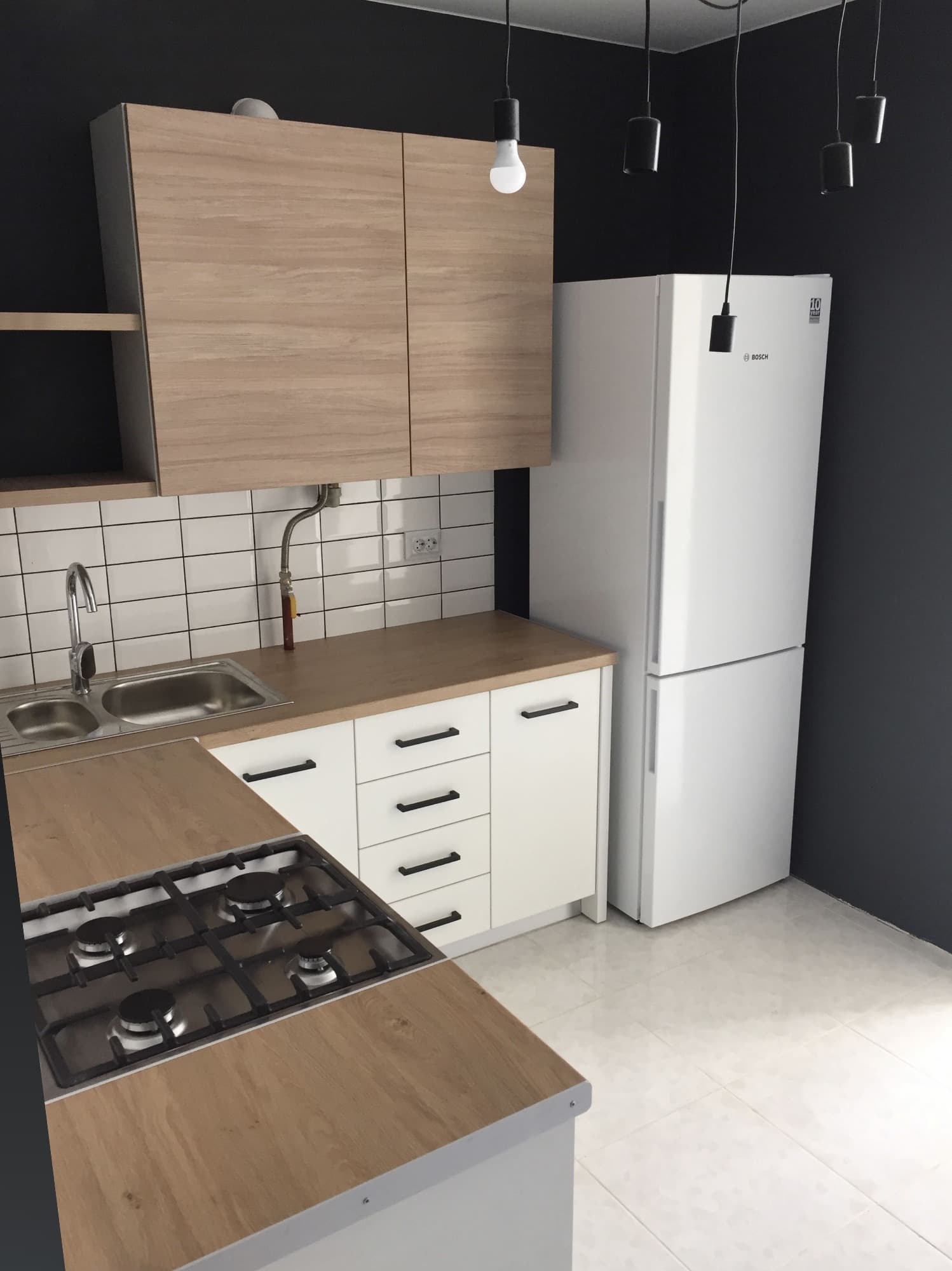 Это кухня, которую мы спроектировали и установили для нашей знакомой. Ей был нужен недорогой вариант молодежной и практичной кухни, на одного-двух человек, с элементами под дерево и монохромной основной цветовой гаммой всей комнаты, по стилю близкой к LOFT.