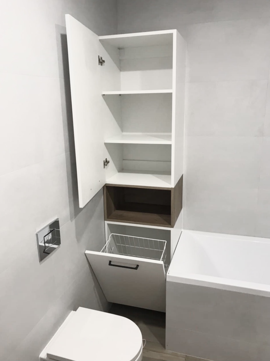 А в этой ванной комнате заказчик попросил сделать под заказ стильный и функциональный пенал в в современном стиле, для которого была специально оставлена ниша за ванной. Мы разделили его на 3 зоны – внизу разместили корзину для белья, посередине оставили место для акцентного блока с открытой полкой для декора и полотенца, а вверху – сделали модуль с дверью и полками для хранения! 🙂