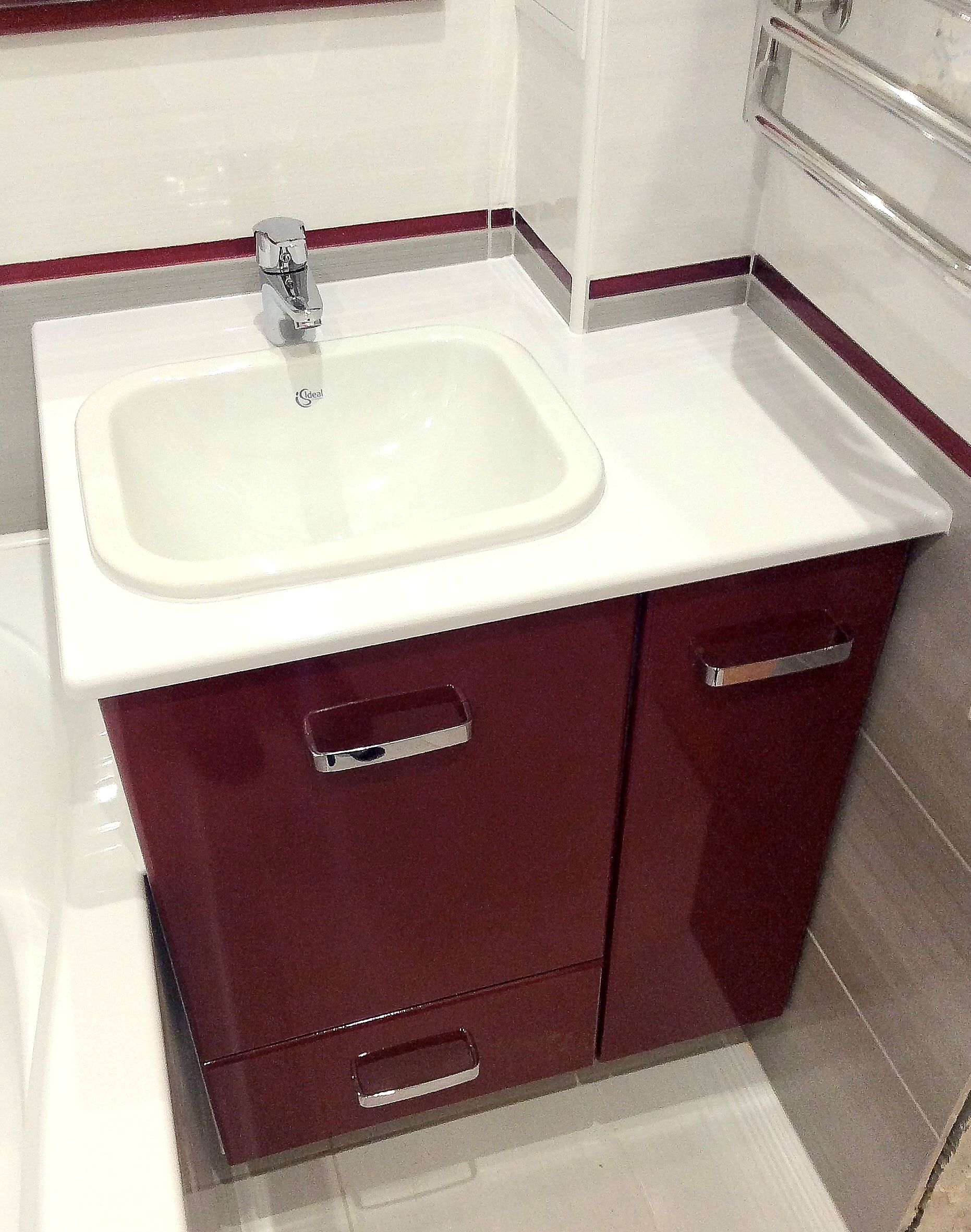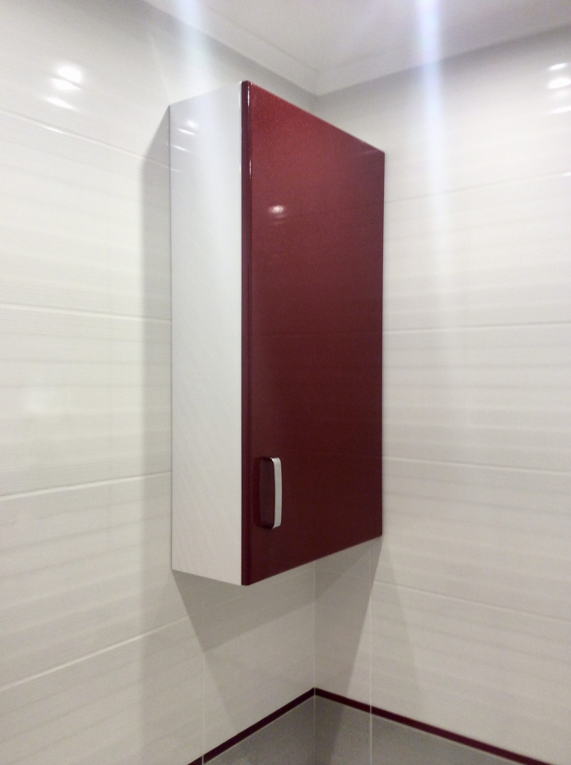 Навесной компактный шкафчик, с одной дверью и полками для хранения внутри и цветом фасада в поддержку темно-красного акцента в плитке на стене – этот шкафчик мы изготовили в поддержку тумбе под умывальник, которую наш клиент заказывал у нас ранее, ее мы прикрепили на втором фото)