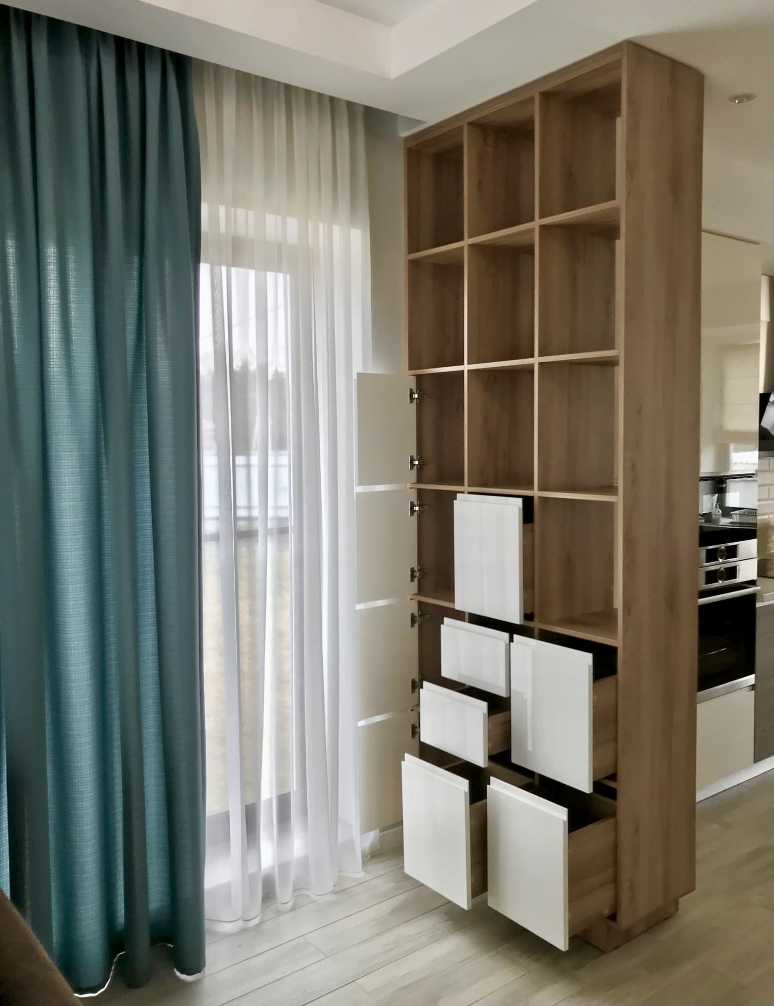 После успешного сотрудничества по изготовлению мебели для ванной комнаты, наша заказчица дополнительно попросила изготовить стеллаж, для разделения зоны кухни и зоны отдыха. Верхняя часть стеллажа открытая и предусмотрена для декора, а нижние модули поделены на секции с дверьми и несколькими выдвижными ящиками. Цветовую гамму и текстуры мы подбирали, подстраиваясь под материалы кухни. Мы аккуратно установили стеллаж вплотную к потолку, и очень рады, что наша клиентка осталась довольна результатом!