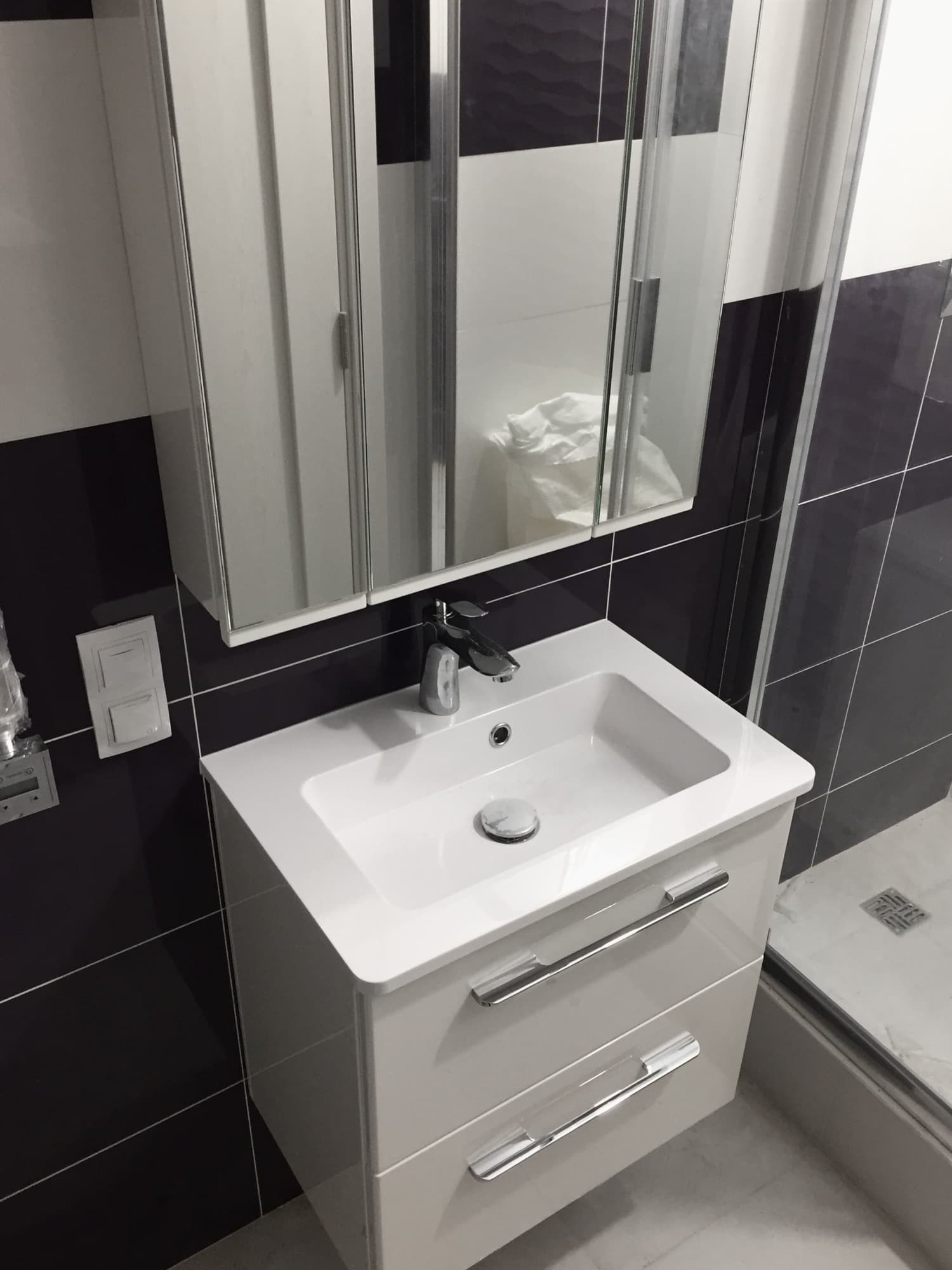 Корпус мебели – австрийское влагостойкое белое ДСП Egger и крашеный МДФ для боковых видимых стенок.