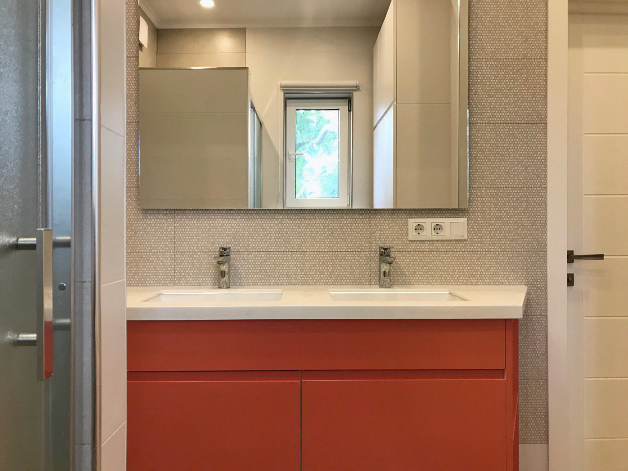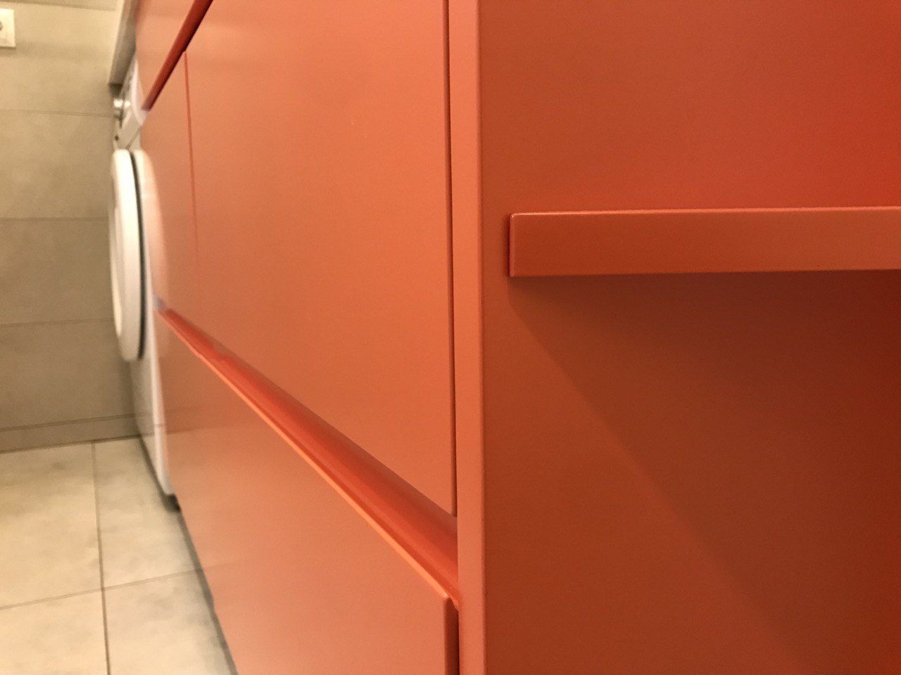 Эту тумбу мы делали в доме наших друзей и мы были очень рады согласовать такой сочный оранжевый оттенок краски, который отлично разбавил бежевый тон всего помещения! Сама тумба спроектирована под 2 умывальника, для хранения мы предусмотрели 4 выдвижных ящика, а также открытые угловые полки в правой части тумбы. Слева под столешницей поместилась стиральная машинка. Над тумбой мы установили прямоугольное влагостойкое зеркало на тонкой подложке. Наш совет всем – не бойтесь привносить яркие оттенки в вашу ванную, это определенно создает настроение и задает более современный стиль! 🙂