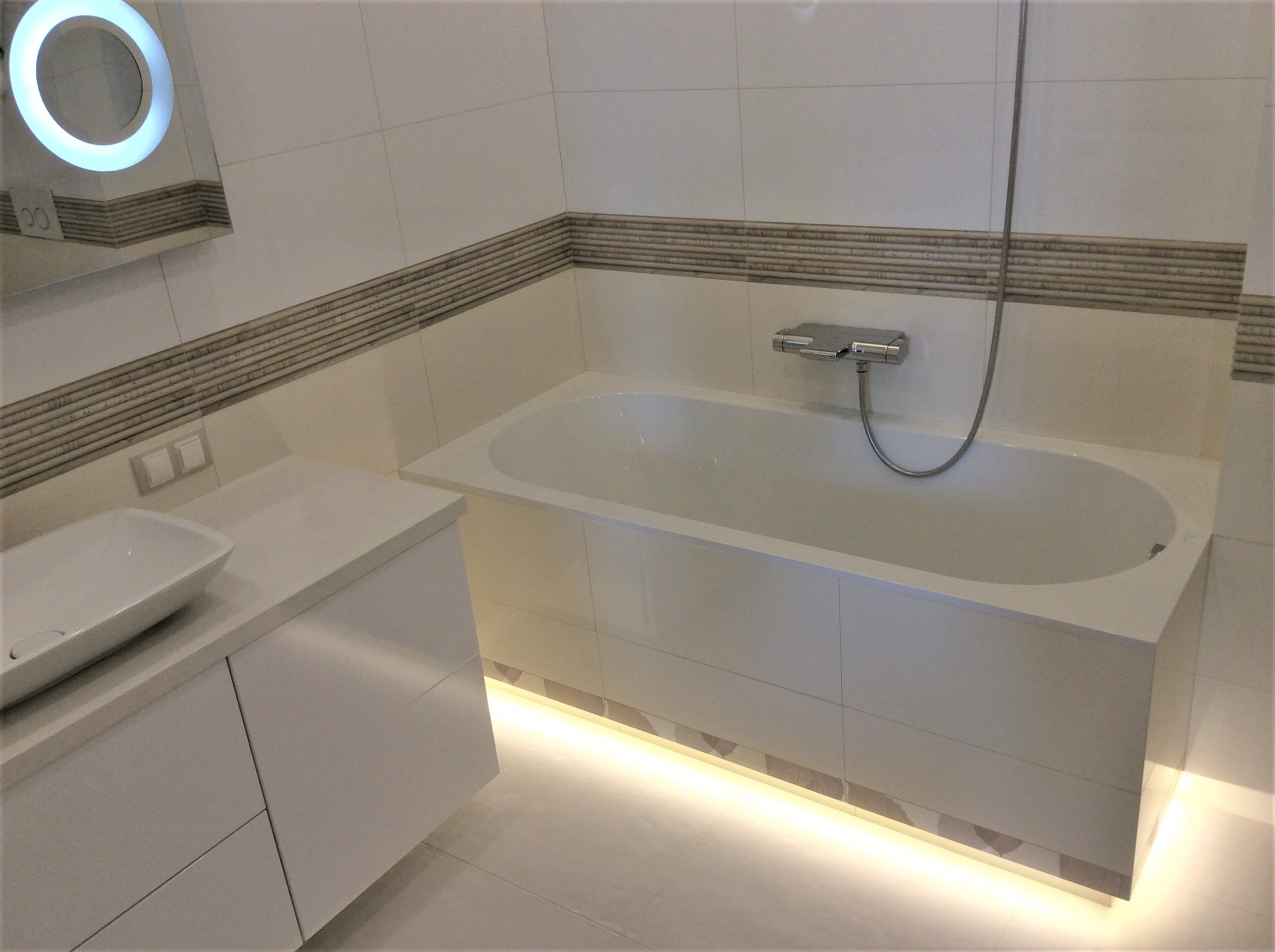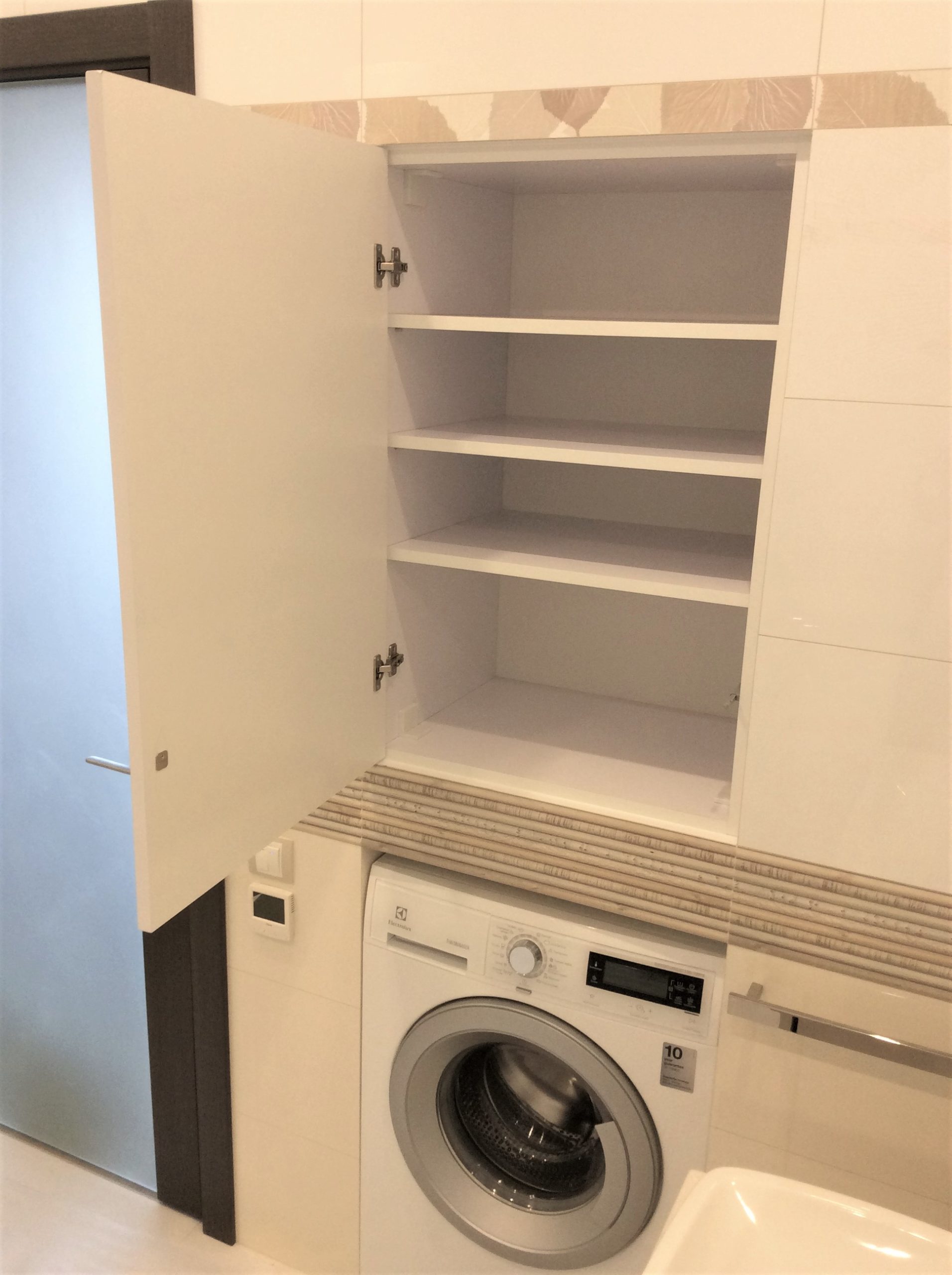 Лаконичный дизайн и пастельные тона делают эту ванную очень воздушной и легкой – и в этом немалую роль сыграла мебель! Заказчик хотел обойтись без ручек на тумбе и свести к минимуму количество разных деталей, чтобы добиться целостного внешнего вида. Мы решили поделить тумбу на три зоны – выдвижной ящик внизу, откидная панель для доступа к коммуникациям вверху, а справа оставить место для крупных предметов и закрыть ту секцию дверью. Изящная раковина-чаша и легкий бежевый оттенок столешницы хорошо дополнили общий дизайн, а ниша с полками над стиральной машиной была также закрыта дверью и таким образом мы создали еще одно удобное место для хранения!)