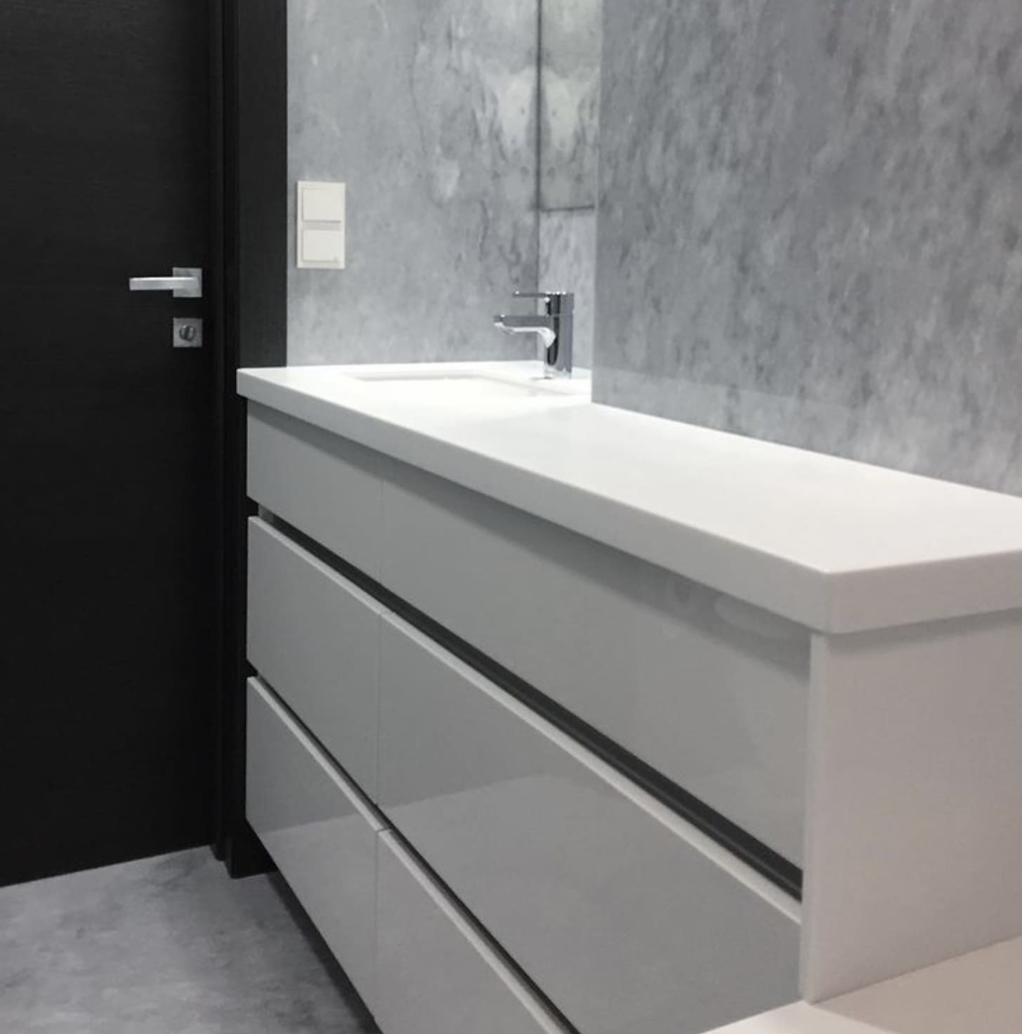 Эту тумбу мы спроектировали для ванной комнаты с необычной геометрией помещения. Из-за минимальной глубины до дверного проема мы разместили раковину в левой части, в своего рода нише,.. а справа расположили более узкие модули. Всего у нас получилось пометить 5 выдвижных ящиков и аккуратно объединить всю конструкцию единой столешницей из искусственного камня!