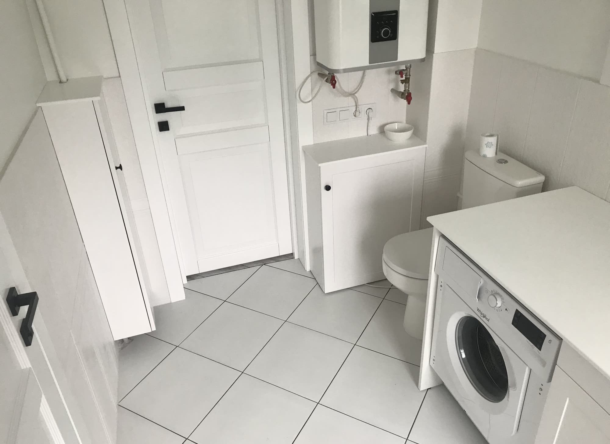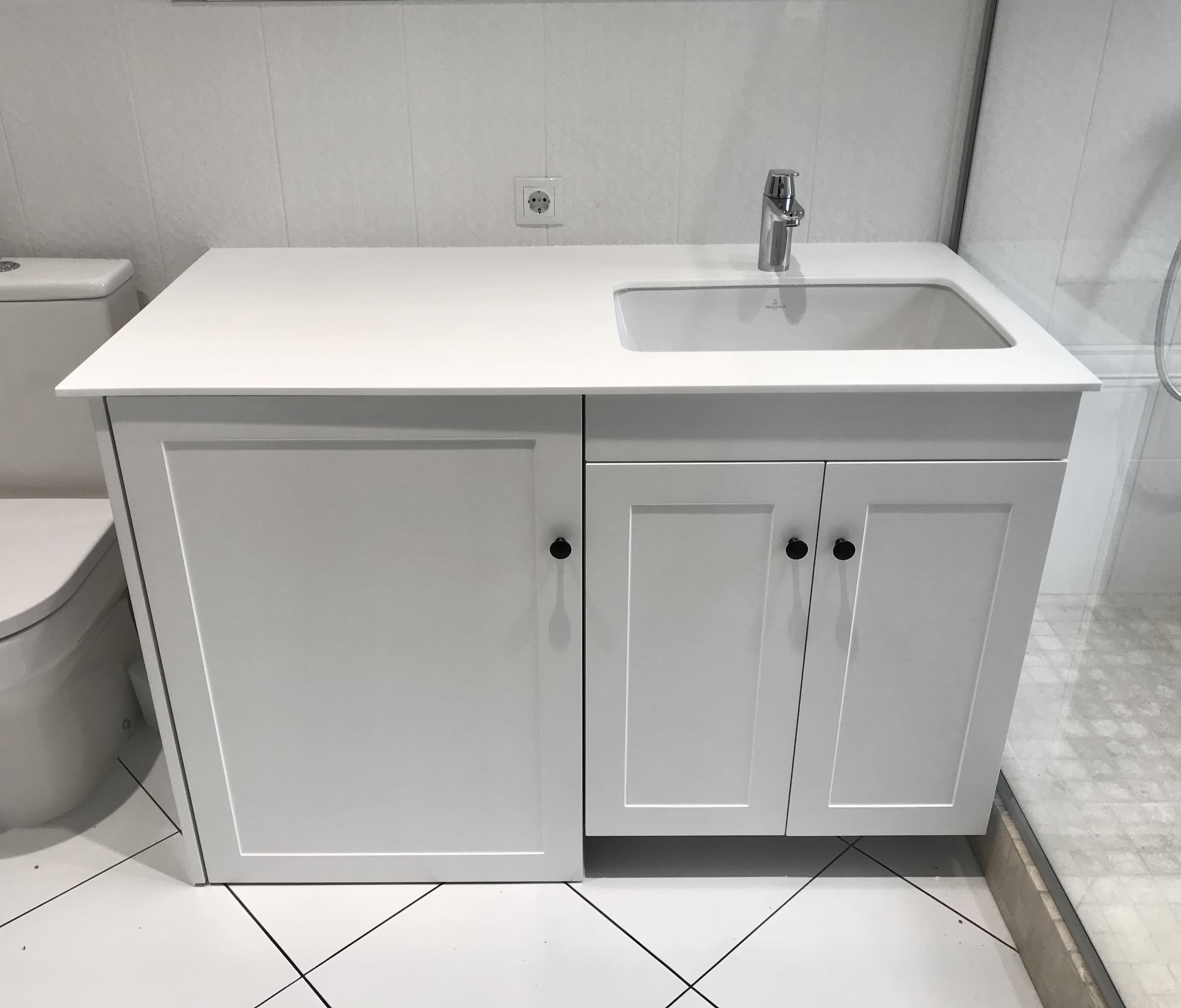 А в этой ванной мы оформляли сразу несколько зон – заказчику нужно было изготовить тумбу под раковину, где разместилась бы и стиральная машинка и секций с дверьми и полкой для хранения, а также нужно было закрыть коммуникации и трубы по бокам от входа в комнату! Кроме этого нужно было поддержать стилистику всего дома и сделать мебель в типичном американском стиле, с белыми рамочными фасадами и черной фурнитурой.