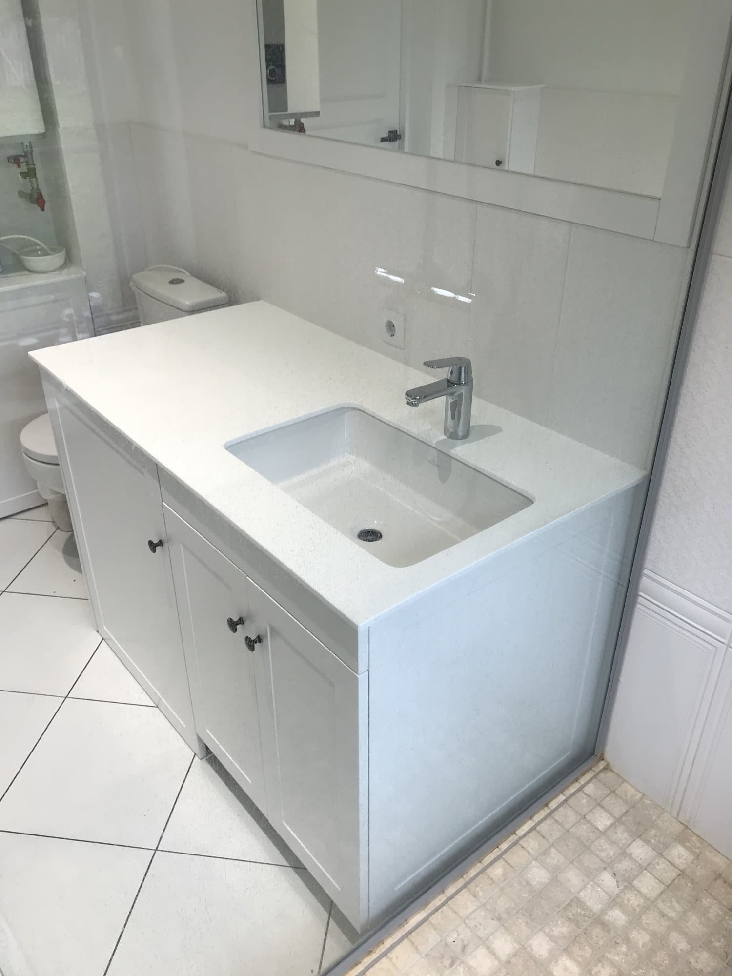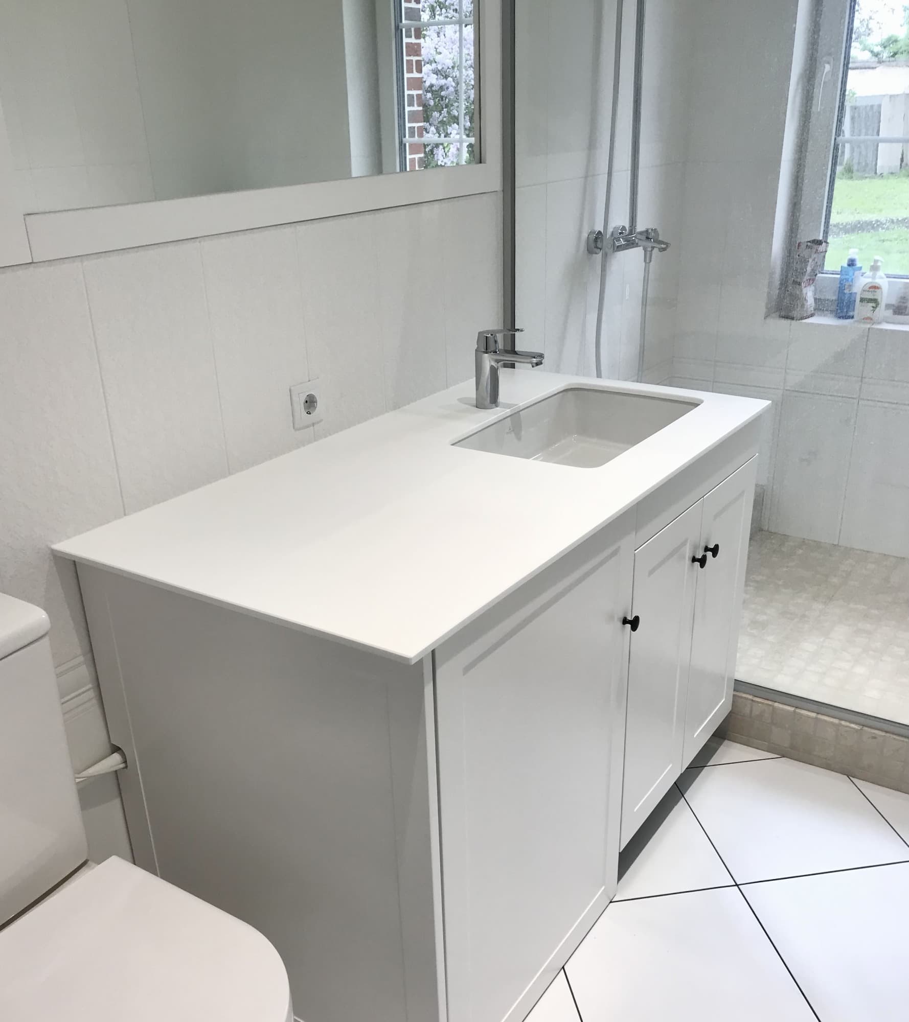 По бокам от двери мы установили пару шкафчиков, для скрытия труб, со столешницами также из искусственного камня.