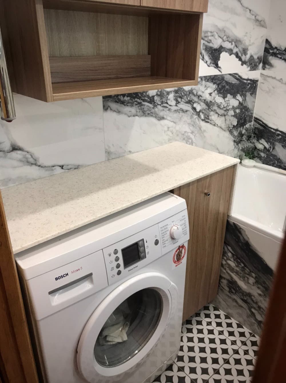 Для этой компактной ванной комнаты мы сделали тумбу справа от стиральной машины с металлической откидной корзиной для белья – она отлично вписалась в нишу между машинкой и ванной! Тумбу и стиральную машину мы накрыли столешницей из искусственного камня, толщиной 15мм с текстурой мелкого терраццо. А выше мы установили шкафчик с двумя дверьми и открытой полкой, для хранения полотенец. Теплая текстура и цвет дерева отлично дополнили черно-белую цветовую гамму плитки и мы рады, что наш заказчик остался доволен нашей работой и качественной мебелью!