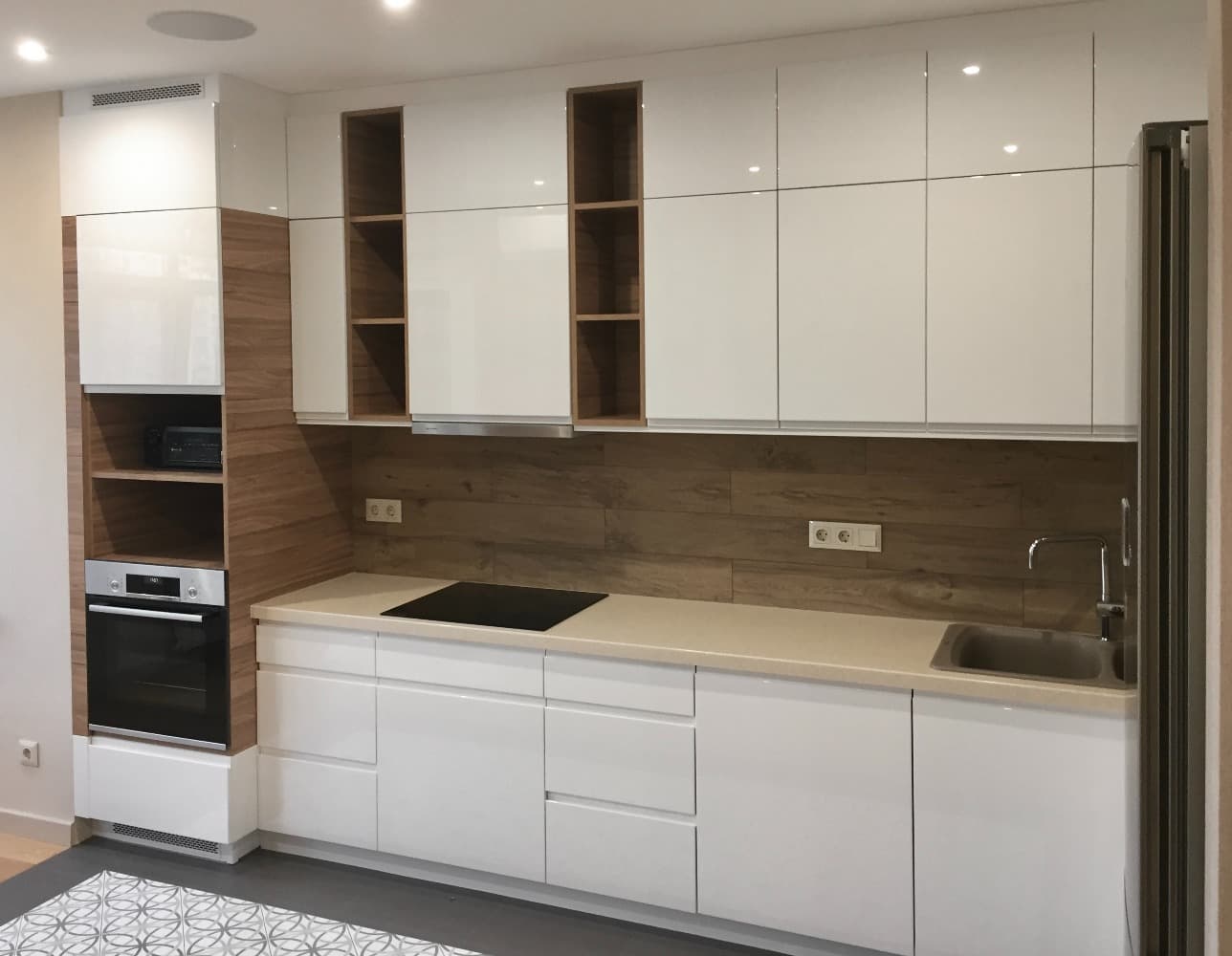 Эту кухню мы спроектировали по визуализации от дизайнера заказчика, которую можете увидеть на первом фото. Немного скорректировав детали, мы согласовали с заказчиком наполнение и финальный внешний вид мебели. Кухня была изготовлена на заказ в Киеве, поэтому мы смогли подогнать все размеры модулей по высоте и ширине к стенам и уровню потолка помещения.