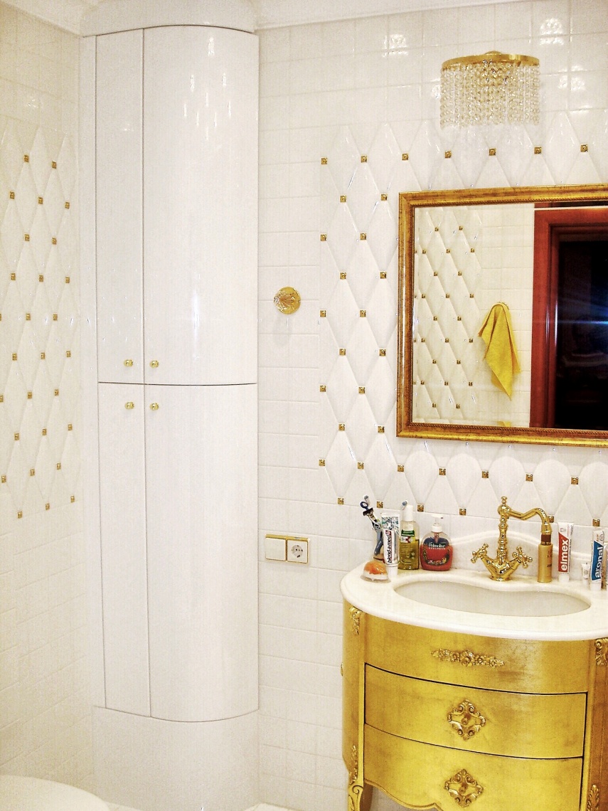 Классический стиль интерьера и сантехнические коммуникации – это две вещи, которые сложно подружить… В этом проекте мы закрыли бойлер и ревизионные люки радиусным угловым встроенным пеналом. Плавные формы фасадов хорошо сочетаются с дизайном тумбы справа, а цвет ручек перекликается с золотыми акцентами на плитке. В итоге наш заказчик остался очень доволен и поблагодарил за то, что получил мебель, идеально подходящую к его планировке!