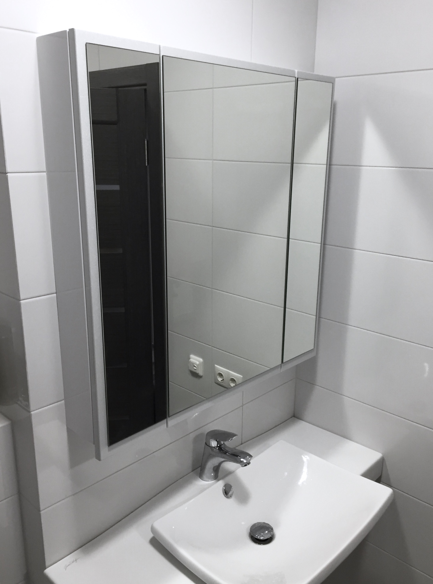 Зеркальный шкафчик на три фасада – центральная дверь максимально широкая, чтобы можно было без проблем рассмотреть свое отображение, находясь по центру раковины. Секции по бокам более узкие, в них удобно хранить вертикальные емкости с косметикой. Выступающая часть фасада снизу используется в качестве ручки, чтобы не пачкать зеркало!)