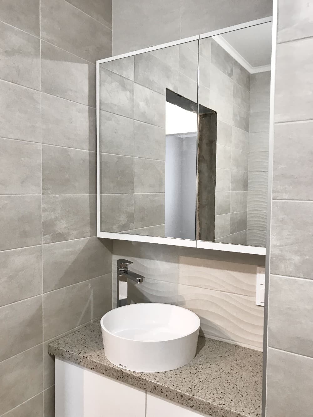 Установили мы шкафчик в нишу над тумбой, которая туда идеально вписалась – и это наша любимая особенность мебели под заказ, так как каждая деталь была спроектирована и изготовлена под конкретные размеры заказчика и с учетом дизайна помещения. 🙂