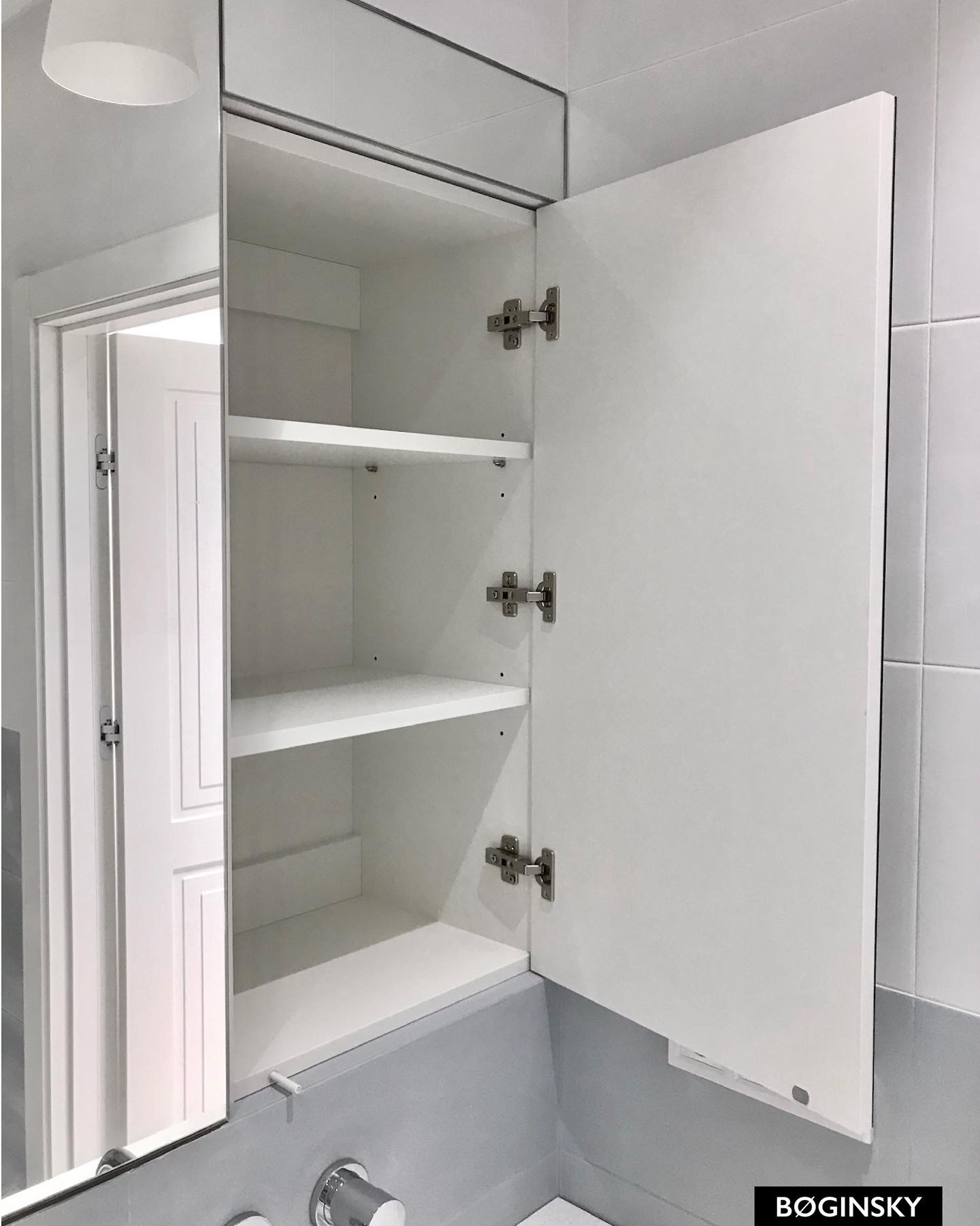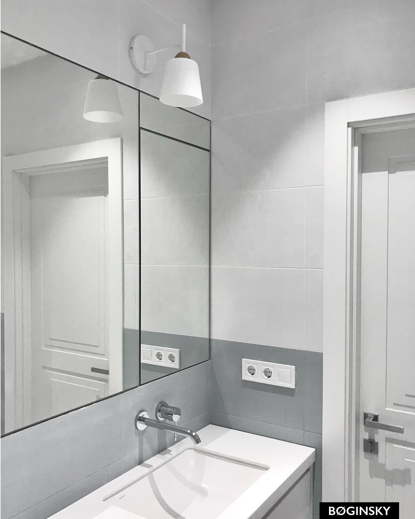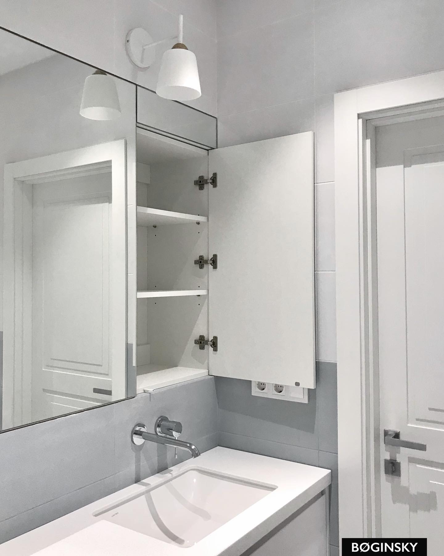 Небольшой зеркальный шкафчик в нишу в ванной комнате, который визуально продлил зеркальную поверхность на всю стену!